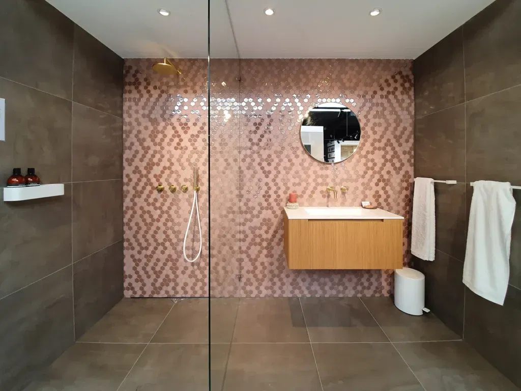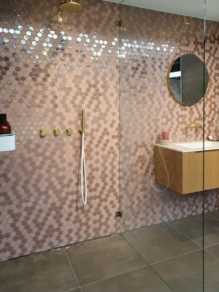 Mischung aus rosa glänzenden und matten sechseckigen Mosaikfliesen, die aus recyceltem Fensterglas hergestellt werden.