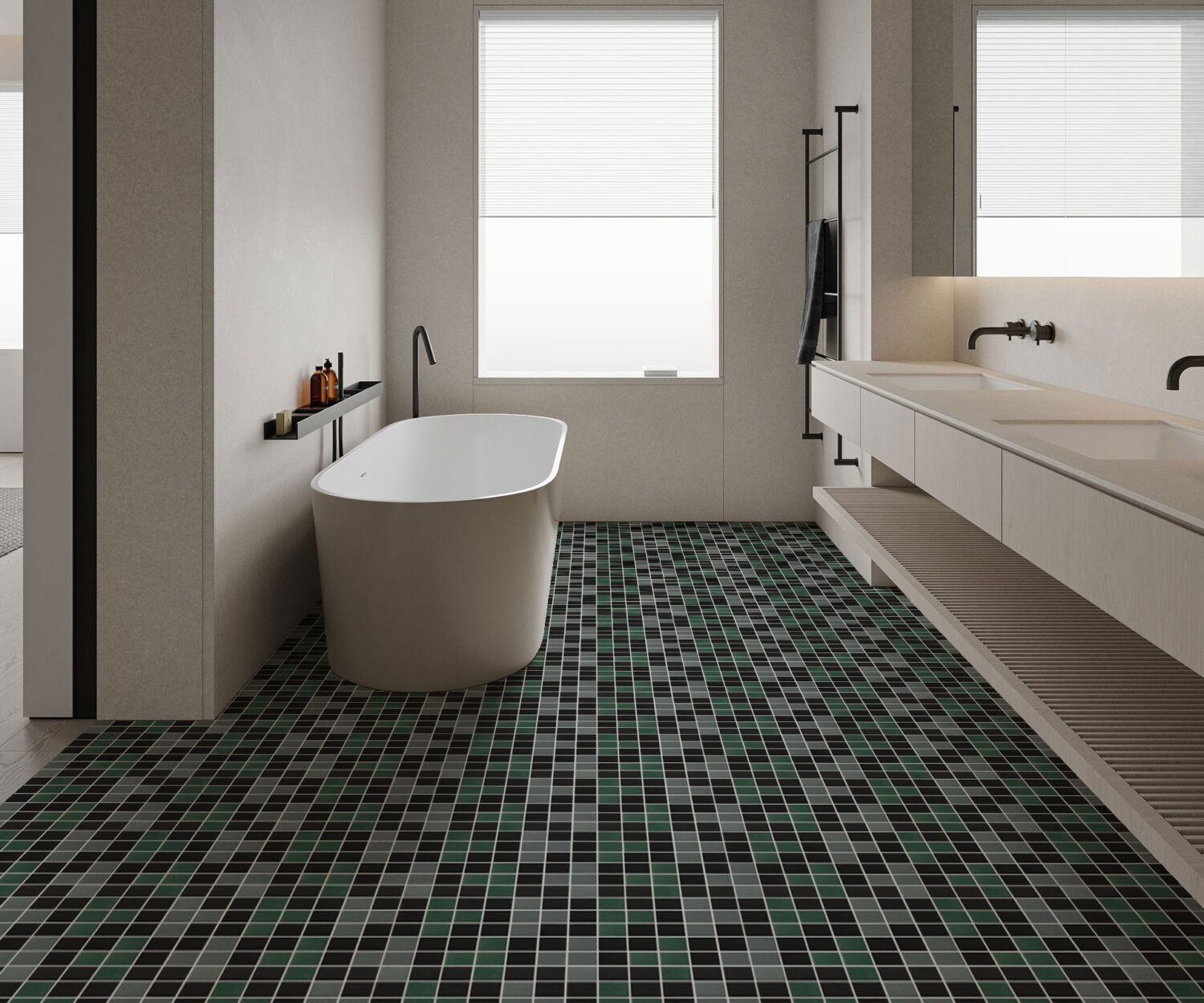 The new 48x48mm square-shaped mosaics have a matt finish and share the same colors as the hexagons: Terra Cotta, Tuscany Gold, Royal Peach, Urban Nature, Camo Green and Navy Blue.